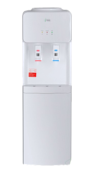Напольный кулер с электронным охлаждением и шкафчиком в нижней части. Краны типа "нажим кружкой" для подачи горячей и холодной воды. Корпус белого цвета с серыми вставками на передней панели. В верхней части расположены индикаторы подключения к сети, нагрева и охлаждения. Недорогой и качественный аппарат.