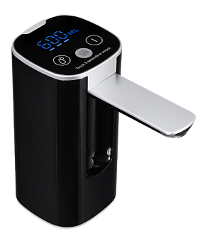 Кран (носик) складной, выдвигается и складывается при нажатии на кнопку. Автоматически складывается через 1 мин. Черный пластиковый корпус с серебристым декором и носиком крана. Гибкая трубка забора воды (для забора воды без остатка).